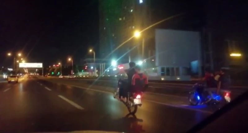 Akıllara durgunluk veren trafik magandalığının adresi megakent İstanbul’un ana halterlerinden birisi olan D-100 karayolu oldu. Kadıköy istikametinden Ankara istikametine seyir halinde olan üç motosikletin birisinde üç, diğer ikisinde sürücüyle birlikte iki kişi bulunuyordu. Yürekleri ağza getiren tehlikeli oyunda ön tekerleğin yerden bağlantısını keserek tek teker üzerinde giden genç kendi canlarını ve trafikteki diğer canları hiç düşünmeden tehlikeye soktu. Dakikalarca süren tehlikeli oyunda sürücüler sık sık emniyet şeridini de ihlal ederken seyir halinde olmamaları gereken şeritte bile ön tekerliği kaldırarak tek teker üzerinde yoluna devam etti.