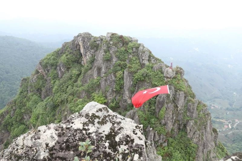 Altınordu ilçesine bağlı Saraycık Mahallesi’nde bulunan 810 rakımlı Yoroz Kent Ormanı’nın zirvesine tırmanan Dağcılık İhtisas Spor Kulübü üyeleri, zirvenin en uç noktasındaki iki kaya arasına Türk Bayrağı asarak Ordu’yu selamladılar.