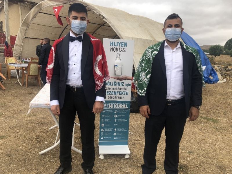 Sivas’ın Altınyayla ilçesinde yaşayan Emrah ve Nazlı çiftçi yapacakları düğünle hayatlarını birleştirme kararı aldı. Yöre adetleri gereği üç gün sürecek düğün, damadın ve gelinin evinde ayrı ayrı başladı. Damat Emrah İbicek kendi evinde başlayan düğünde davetlileri ve tebrikleri kabul etti. Pandemi kuralları gereği misafirlerine yemek ikramında bulunamayan damat, davetlileri maske ve dezenfektan ikramında bulundu. Maskesini takan ve ellerini dezenfekte eden davetiler düğün çadırına alındı. Damat oyunu da sosyal mesafe kuralları gereği mesafeli bir şekilde gerçekleştirildi.