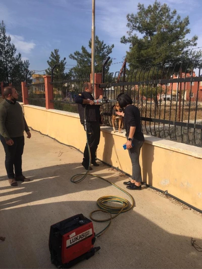 Mersin’de bir okulun demir parmaklıklarına sıkışan köpek, itfaiye ekiplerince kurtarıldı.
