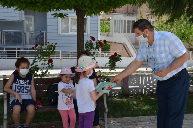 Manisa’nın Demirci ilçesinde sokağa çıkan 0-14 yaş çocuklara Belediye Başkanı Selami Selçuk ve eşi Güzide Selçuk, boyama ve hikaye kitapları hediye etti.