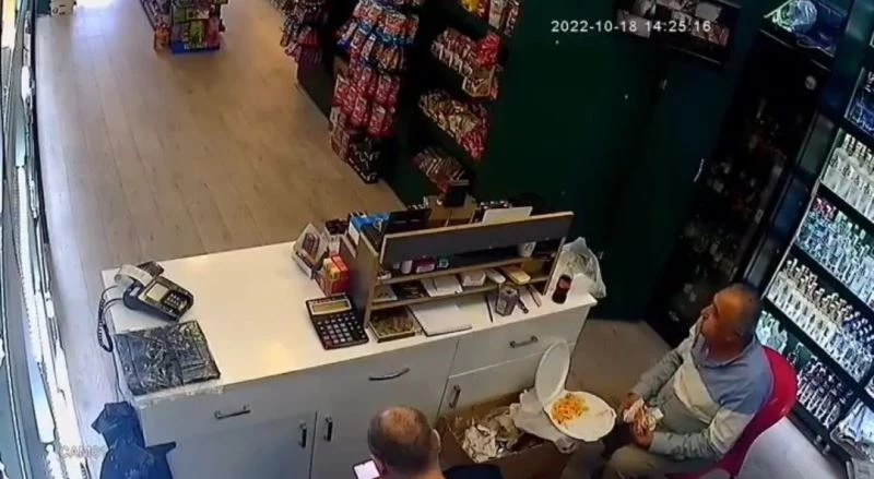 Aydın’ın Kuşadası ilçesinde dün 4.1 büyüklüğünde meydana gelen deprem sırasında bir işletmede yemek yiyen vatandaş, deprem paniği ile dışarı çıkarken içeceğini de yanına aldı. Güvenlik kamerasına yansıyan görüntüler sosyal medyada gündem oldu.