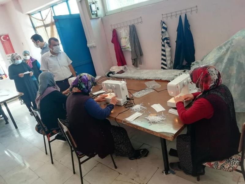 Derebucak’ta gönüllü usta öğreticiler ve kursiyerler koruyucu maske üretiyor