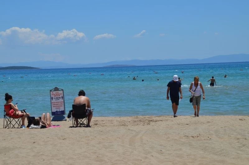 Plaj içerisine ve şezlongların arasından uyarı levhaları ve de mesafe konuldu. Kimi tatilciler şezlongda güneşlenirken, kimileri ise mesafeli oturarak güneşin ve denizin tadını çıkardı.