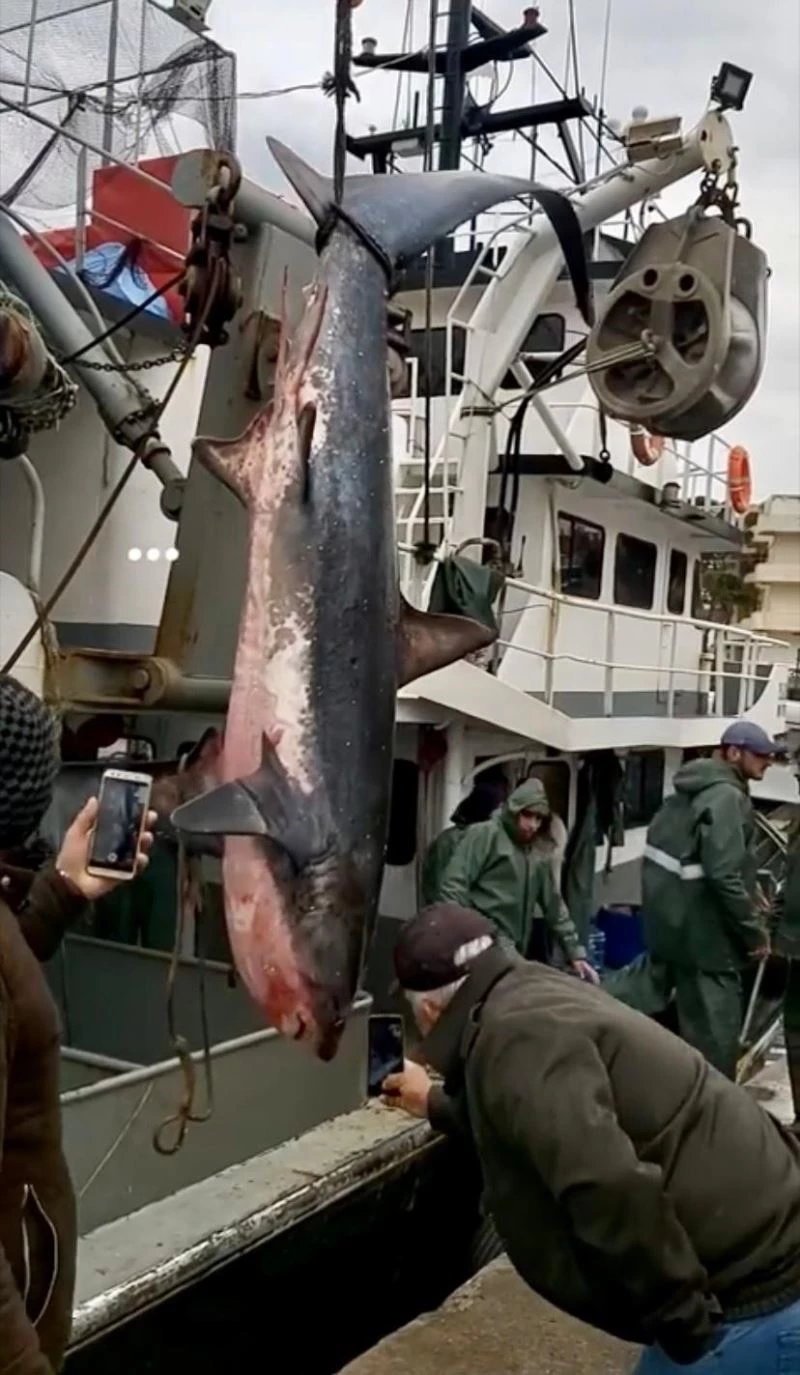 Dün gece Ege Denizi’ne açılan Didim’deki balıkçıların ağına köpekbalığı takıldı. Balık avının sonlanmasının ardından balıkçılar ağa takılan köpek balığını görünce şaşkına uğradı. 200 kilonun üzerinde olduğu tahmin edilen köpek balığı balıkçı tarafından Didim iskelesinde kıyıya çıkartıldı.