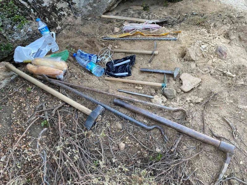 Aydın İl Jandarma Komutanlığı tarafından kaçakçılık kanuna muhalefet suçuna yönelik çalışmalar aralıksız olarak sürüyor. Edinilen bilgiye göre, Söğütçük mevkiinde farklı noktalarda 2 aracın görülmesi üzerine çevrede yapılan aramada; patlayıcı madde ile kaçak kazı yapıp tarihi eser arayan B.G., A.S., H.Ç. ve D.A isimli şahıslar kazı malzemeleri ile beraber suçüstü yakalanarak gözaltına alındı. Yapılan çalışma neticesinde; 2 elektrik funyeli dinamit, 20 metre kablo, 50 cm hilti ucu, 1 adet akü, 1 adet kürek, 1 adet kazma, 1 adet balyoz, 1 adet çekiç, 2 adet keser, 2 adet burç, 1 adet keski demiri, 1 adet süpürge ve 1 adet yaşam malzemesi ele geçirildi.