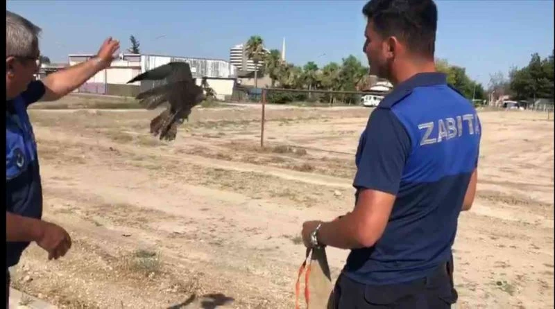 Cumhuriyet Mahallesi’nde devriye gezen zabıta memurları Donuktaş Tapınağı önünde boş bir arsada kuş sesi duydu. Araçtan inen zabıta komiseri Hakan Öcal ile zabıta memuru Ali Gözüküçük, bir doğanın ayaklarından direğe bağlı olduğunu gördü. Zabıta memurları ilk olarak kuşu direkten kurtardı, daha sonra bağlanmış olan ayaklarını ipten kurtardı. Hayvansever zabıta memuru Ali Gözüküçük, su verdikten sonra kuşun herhangi bir yarası olmadığını görünce kuşu doğaya salıverdi.