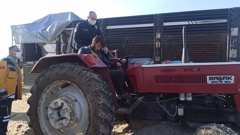 Samsun’un Bafra ilçesinde direksiyon başında sızan traktör sürücüsü küspe yığınına çarparak durdu.