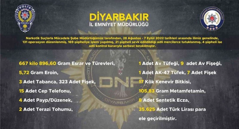 Emniyetin sosyal medya hesabından yapılan paylaşımda, “Narkotik Suçlarla Şube Müdürlüğümüz tarafından 28 Ağustos-7 Eylül tarihlerinde kent genelinde 131 operasyon düzenlendi, 169 şüpheliye işlem yapılmış, 21 şüpheli sevk edildiği adli mercilerce tutuklanmış, 4 şüpheli ise adli kontrol kararıyla serbest bırakılmıştır” denildi.