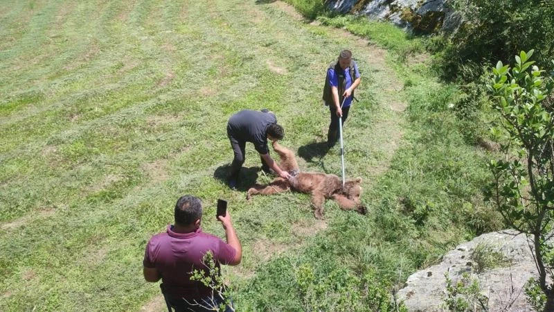 Olay ilçeye bağlı Ulukaya köyü Şelale üstü mevkiinde meydana geldi. Ayı sesi duyan vatandaşlar, bölgeye geldiklerinde bir ayının domuz tuzağına yakalandığını gördü. Yanında yavrusu da bulunan boz ayı kapandan kurtulmaya çalışsa da başarılı olamazken, durum jandarma ve Doğa Koruma ve Milli Parklar Şube Müdürlüğü ekiplerine bildirildi. Görevliler tarafından uyutulan boz ayı daha sonra yakalandığı telin arasından kurtarıldı. Ayının kurtulmak için hareket ettiği sırada vücudunda oluşan yaraya ilk müdahale veteriner hekim tarafından yapıldı. Kendine gelmesi beklenen ayı daha sonra doğaya bırakıldı.