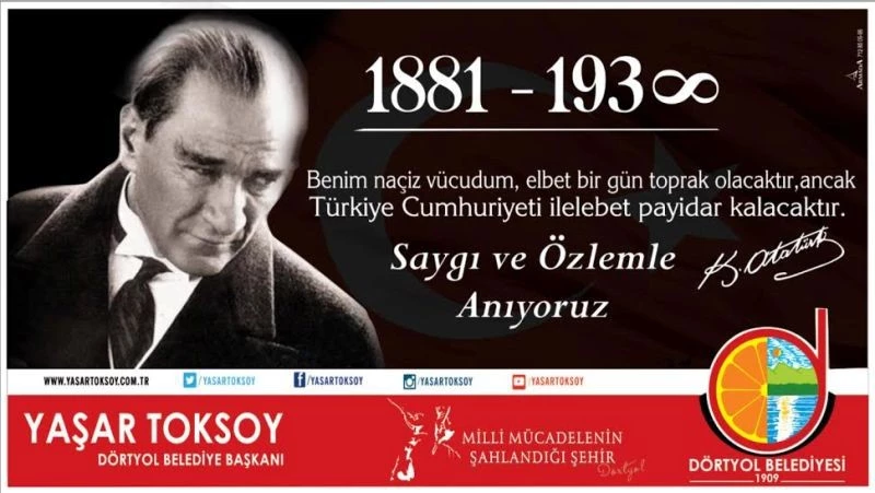 Dörtyol Belediye Başkanı Yaşar?Toksoy Ulu Önder Gazi Mustafa Kemal Atatürk?ün 77. ölüm yıldönümü nedeniyle yayınladığı mesajında; ?Mustafa Kemal Atatürk, kendisini aziz milletimize adamış, bağımsızlık ve hürriyet yolunda karşısına çıkan bütün engelleri aşarak, kısa hayatına sığdırdığı büyük başarılarla başka milletlere de örnek olmuş, milletimizin her alanda yükselmesi için yılmadan çaba göstermiş tarihi bir kişiliktir.