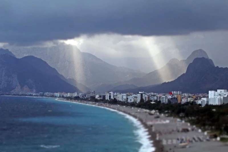 Antalya’nın dünyaca ünlü Konyaaltı Sahili’nde denizin rengi ikiye, sahil kısmı da dalgaların dövmesiyle beyaza büründü. Yağmur bulutlarıyla birlikte oluşan ışık hüzmesini görenler ise manzarayı görünce cep telefonuna sarıldı.