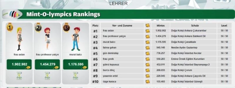 Öğretmenler kategorisinde ilk 3 sırayı İTÜ ETA Vakfı Doğa Koleji öğretmenleri paylaştı. Öğretmenlerin katıldığı “Minticity Lehrer” kategorisinde, Kolejin Almanca Öğretmenleri Nuray Coşkun Aslan birinci, Burcu Yalçın ikinci, Murat Balcı üçüncü olurken, Şükrü Kapusuz, Gün Demiralay, Burcu Dinç, Yasemin Erbil ve Özge Karaca ilk 10’da yer aldı.