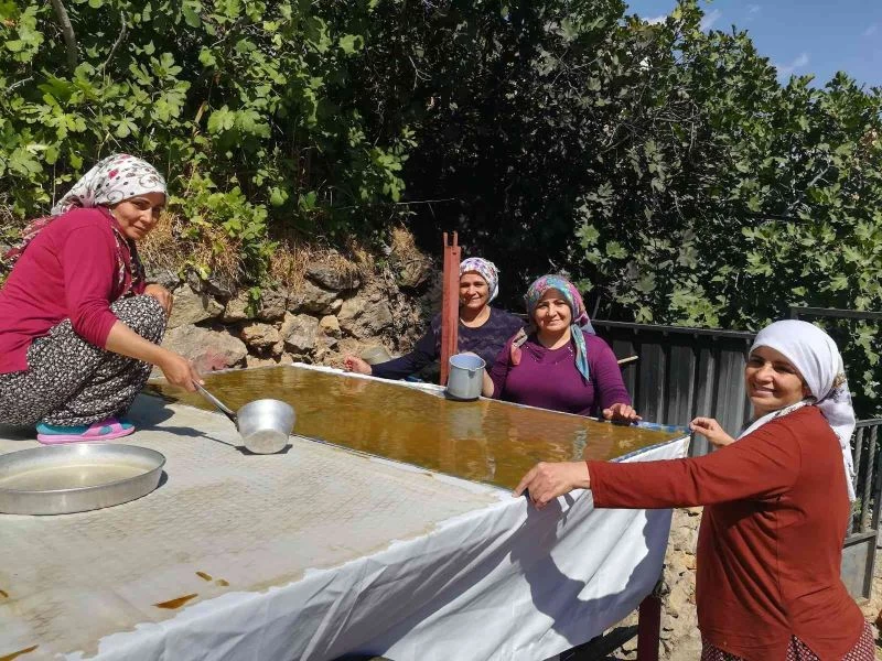 Dutun önemli geçim kaynağı olduğu Erzincan’ın Kemaliye ilçesinde kadınlar, zorlu pestil ve pekmez yapımını imece usulü gerçekleştiriyor.