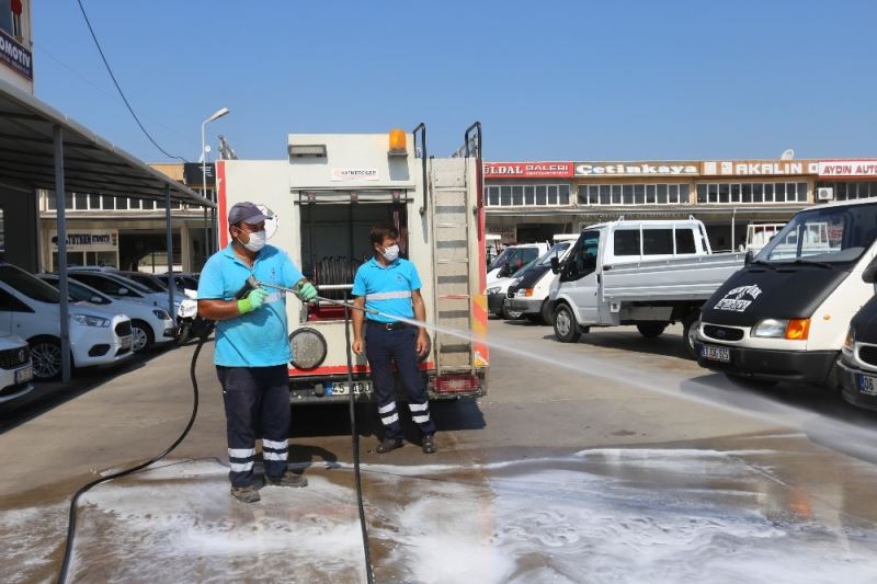 Çalışmalar için kolları sıvayan Efeler Belediyesi Temizlik İşleri Müdürlüğü’ne bağlı ekipler, temizlik araçları yardımıyla tazyikli ve köpüklü su kullanarak alanı köşe bucak temizledi. Normalleşme döneminde de sıkı koronavirüs tedbirleri alan Efeler Belediyesi çalışanları galericiler sitesini dezenfekte etmeyi de ihmal etmedi.