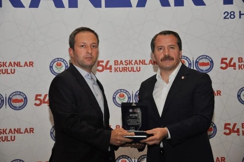 Memur-Sen ve Eğitim-Bir-Sen Genel Başkanı Ali Yalçın, Kütahya 1 No’lu Şube Başkanı Fatih Köse’ye birincilik plaketi takdim etti.