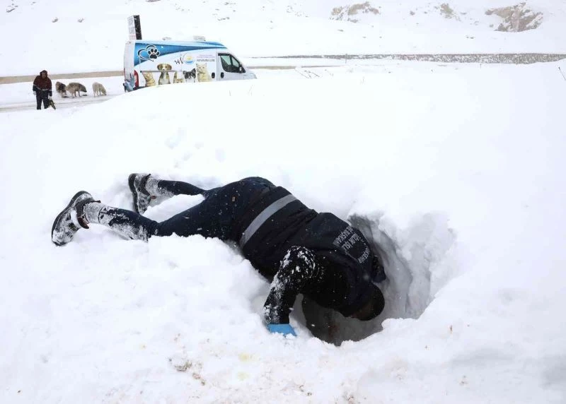 Van Büyükşehir Belediyesi kentte etkili olan yoğun kar yağışı ve soğuk havada yiyecek bulmakta zorlanan hayvanlar için besleme çalışmalarını sürdürüyor. Hayvanların soğuk ve yağışlı havadan etkilenmemesi için çalışan Sağlık İşleri Daire Başkanlığı personelleri, mama çalışmalarının yanında yavru köpeklerin olduğu noktalara kulübe de kuruyor. Özalp yolu üzerinde bulunan dağlık alanda sokak hayvanları ile yabani hayvanlara mama bırakan ekipler, kar oyuğunun arasında yavru köpekleri görünce harekete geçti. Anne köpek ve 2 yavrusunu bulundukları kar oyuğundan çıkaran ekipler, köpekleri oyuğun yanında kurdukları kulübeye bıraktı. Kulübe içerisine branda serip mama ve su bırakan ekipler, anne ve yavru köpekleri donmaktan da kurtardı.
