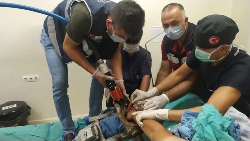 Yaralı gencin el ve parmaklarını, sıkıştığı yerden kurtarmak için Hatay Büyükşehir Belediyesi Dörtyol İtfaiye Amirliği ekiplerinden yardım istendi.