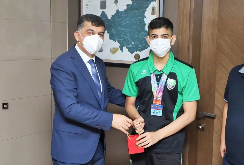 Zorlu rakipleri ve engelleri bir bir aşarak başarı hikayesini şampiyonluklarla taçlandıran altın kulaç Mehmet Bulut ve antrenörü Mehmet Emin Bay’ı makamında misafir eden Şehitkamil Belediye Başkanı Rıdvan Fadıloğlu, büyük başarılara imza atan sporcu ve antrenörünü ödüllendirdi.