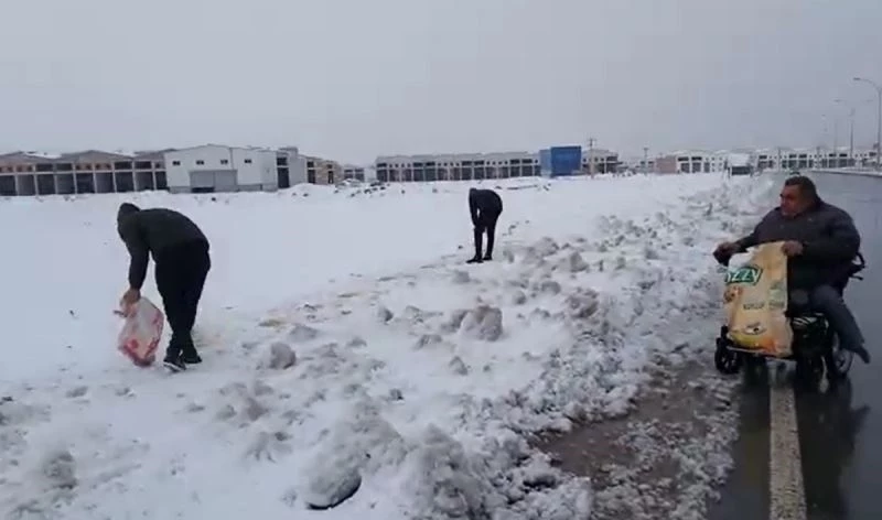 Kahramanmaraş’ta engelli genç, kar yağışının etkili olduğu kentte engelli aracı ile sokak hayvanlarına mama bıraktı.