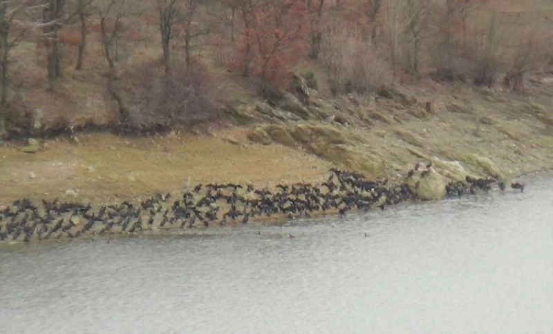 Karabatak ve balıkçıl kuşlarının Enne Barajı’nda yiyecek araması, İHA tarafından havadan da görüntülendi.