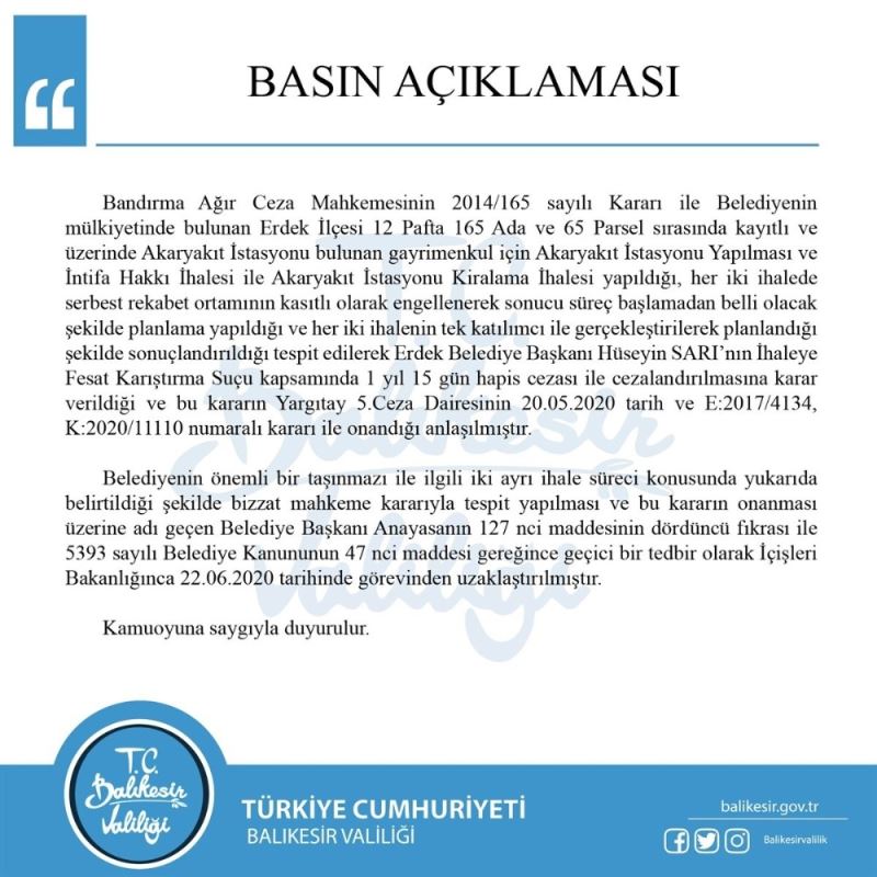Konuyla ilgili Balıkesir Valiliğince yapılan açıklamada "Bandırma Ağır Ceza Mahkemesinin 2014/165 sayılı Kararı ile Belediyenin mülkiyetinde bulunan Erdek İlçesi 12 Pafta 165 Ada ve 65 Parsel sırasında kayıtlı ve üzerinde Akaryakıt İstasyonu bulunan gayrimenkul için Akaryakıt İstasyonu Yapılması ve İntifa Hakkı İhalesi ile Akaryakıt İstasyonu Kiralama İhalesi yapıldığı, her iki ihalede serbest rekabet ortamının kasıtlı olarak engellenerek sonucu süreç başlamadan belli olacak şekilde planlama yapıldığı ve her iki ihalenin tek katılımcı ile gerçekleştirilerek planlandığı şekilde sonuçlandırıldığı tespit edilerek Erdek Belediye Başkanı Hüseyin SARI’nın İhaleye Fesat Karıştırma Suçu kapsamında 1 yıl 15 gün hapis cezası ile cezalandırılmasına karar verildiği ve bu kararın Yargıtay 5.Ceza Dairesinin 20.05.2020 tarih ve E:2017/4134, K:2020/11110 numaralı kararı ile onandığı anlaşılmıştır.