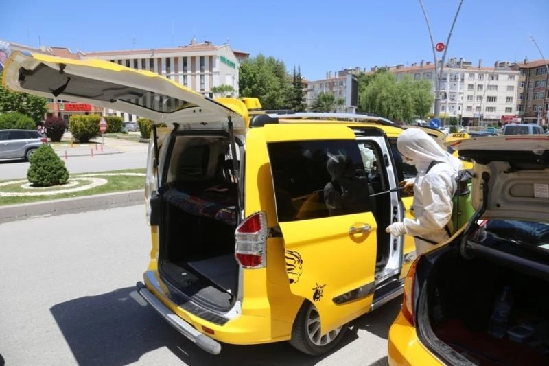 Konya’nın Ereğli İlçe Belediyesi Korona virüs (Covid-19) tedbirleri kapsamında ticari taksileri dezenfekte etmeyi sürdürüyor.
