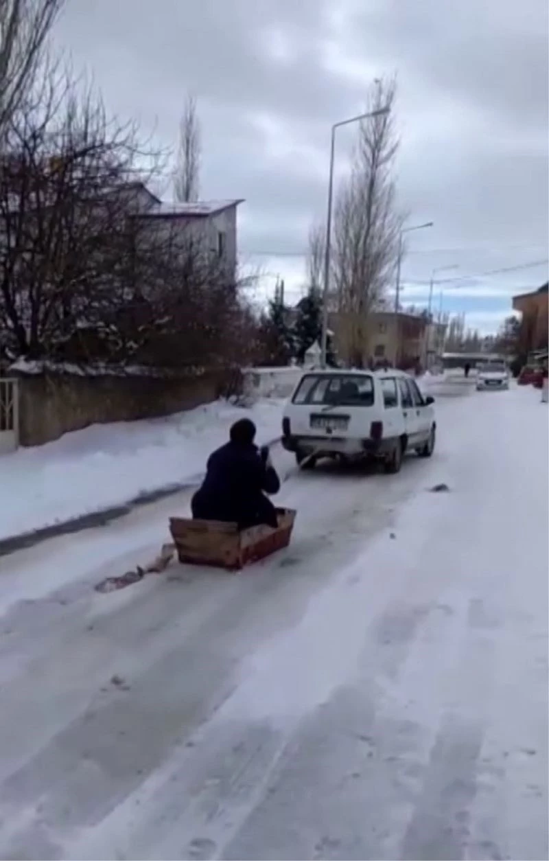 Sivas’ta etkili olan kar yağışı vatandaşlar tarafından sevinçle karşılandı. Sivas’ın Zara ilçesinde yaşayan iki arkadaş ise kar yağışını eğlenceye çevirdi. Kafadar iki arkadaştan Erkan Demirtaş, otomobilin direksiyonuna geçerken Halil Yılmaz ise kızak yaptıkları eşek yemliğinin içine bindi. Otomobil yemliği karla kaplı sokaklarda çekerken yemlik içindeki Yılmaz ise kayarak doyasıya eğlendi. O anlar ise cep telefonu kamerasına yansıdı.