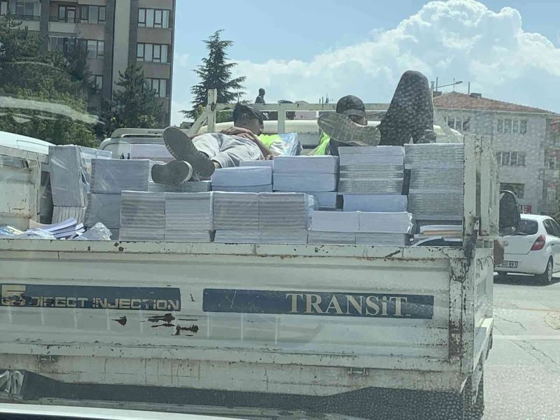 Eskişehir’de canını hiçe sayan iki şahıs, kitap yüklü kamyonet kasasında yatarak seyahat etti.