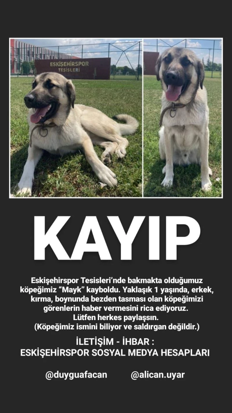 “Eskişehirspor Tesisleri’nde bakmakta olduğumuz köpeğimiz ‘Mayk’ kayboldu. Yaklaşık 1 yaşında, erkek, kırma, boynunda bezden tasması olan köpeğimizi görenlerin haber vermesini rica ediyoruz. Köpeğimiz ismini biliyor ve saldırgan değildir.”