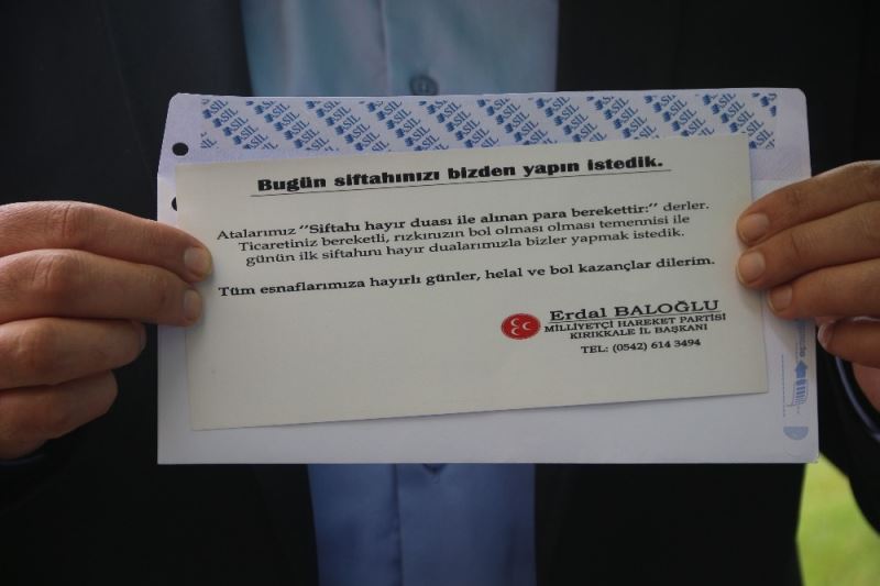 Milliyetçi Hareket Partisi (MHP) Kırıkkale İl Başkanlığı, normalleşme süreci çerçevesinde hizmet vermeye başlayan esnafa zarf içerisinde ‘siftah parası’ bıraktı.