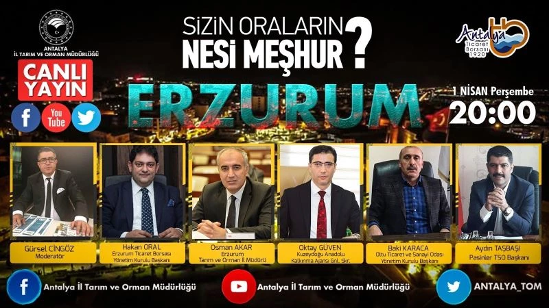 Antalya Tarım ve Orman Müdürlüğü ile Antalya Ticaret Borsası tarafından ortaklaşa gerçekleştirilen ve sosyal medya hesapları üzerinden canlı olarak yayınlanan “ Sizin Oraların Nesi Meşhur Erzurum” programına katılan Erzurum Ticaret Borsası Yönetim Kurulu Başkanı Hakan Oral, Coğrafi İşaretli Ürünler hakkında detaylı bilgiler verdi.