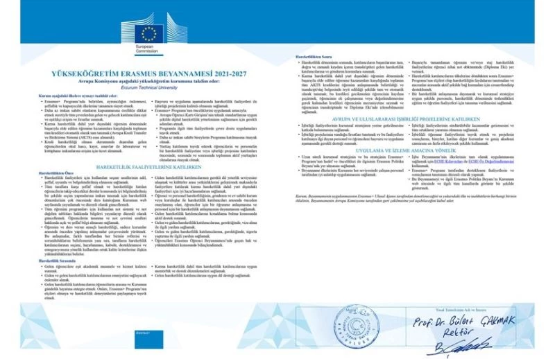 Erzurum Teknik Üniversitesi (ETÜ) Erasmus Koordinatörlüğü’nün 2020 yılının Mayıs ayında Avrupa Komisyonu’na yaptığı Erasmus Charter for Higher Education-ECHE (Yükseköğretim Erasmus Beyannamesi) başvurusu, yapılan değerlendirmeler sonucunda 100 tam puan alarak 2021-2027 dönemi için ECHE Akreditasyonuna sahip olmaya hak kazandı.