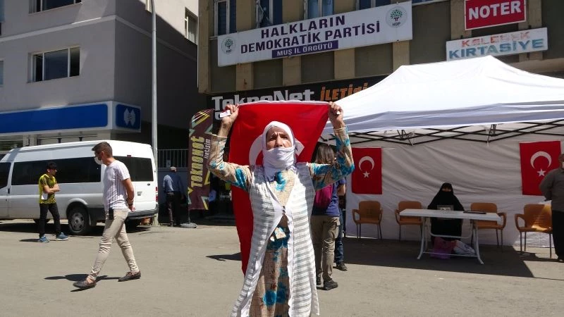 Aylardır HDP Muş İl Başkanlığı önünde oturan annelerin eylemi devam ediyor. Geçen hafta 3 kişinin teslim olmasını sevinçle karşılayan annelerden Gülbahar Teker, HDP İl Başkanlığı önünde sevinç gösterisi yaptı. Daha sonra Türk bayrağını öpüp alnına koyan anne Teker, ailelerle çadıra geçti. Aileler, ardından parti binası önünde çocuklarının kaçırılmasını protesto etti. Ellerine dövizler alan aileler; "Halk düşmanı parti", "Evlatlarımızı vereceksiniz", "Ha HDP ha PKK", "Türk Kürt kardeştir, HDP kalleştir" ve "Halkı dolandıran parti" dövizleri açarak tepki gösterdi.