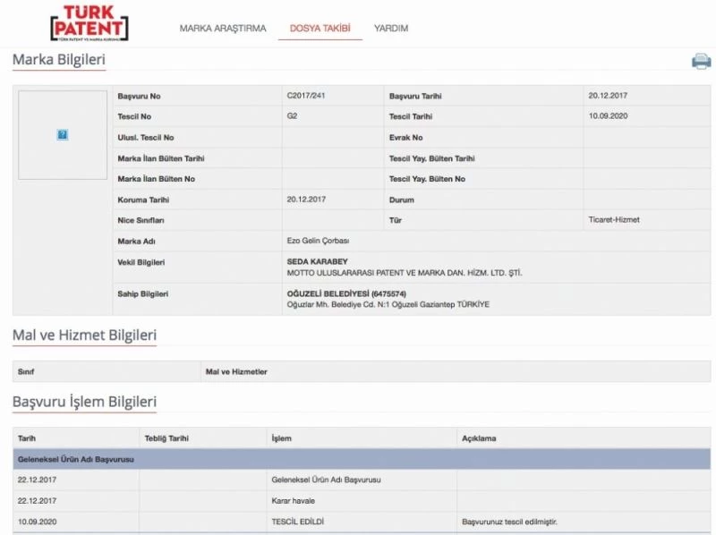 Oğuzeli Belediye Başkanı Mehmet Sait Kılıç yaptığı açıklamada, “10 Eylül 2020 tarihi itibariyle ‘Ezo Gelin Çorbası’ tescil işlemleri tamamlanmış olup Türk Patent ve Marka Kurumu tarafından Coğrafi İşaret (Geleneksel Ürün Adı) alarak, Oğuzeli adına tescillenmiştir. Geleneksel lezzetlerimize büyük önem veriyoruz. ‘Ezo Gelin Çorbası’da bunlardan bir tanesi. Gastronomi Kentine yakışır çalışmalar yapmaya gayret gösteriyoruz. Daha önce Oğuzeli Nar’ımız tescillenmişti. Şimdi Oğuzeli Kurutmalığı ve Oğuzeli Nar Ekşisi başvurularımızın sonucunu bekliyoruz. Başvurularımız sonuçlandığı zaman Oğuzeli’ne ait dört adet ürünümüz tescillenmiş olacak. Buda bu ürünlere olan katkıyı daha çok arttıracak” ifadelerini kullandı.