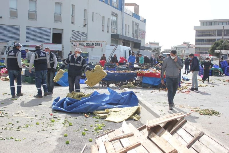 Fırtına nedeniyle üzerine çatı düşen pazaryerinde temizleme çalışmaları sürüyor.