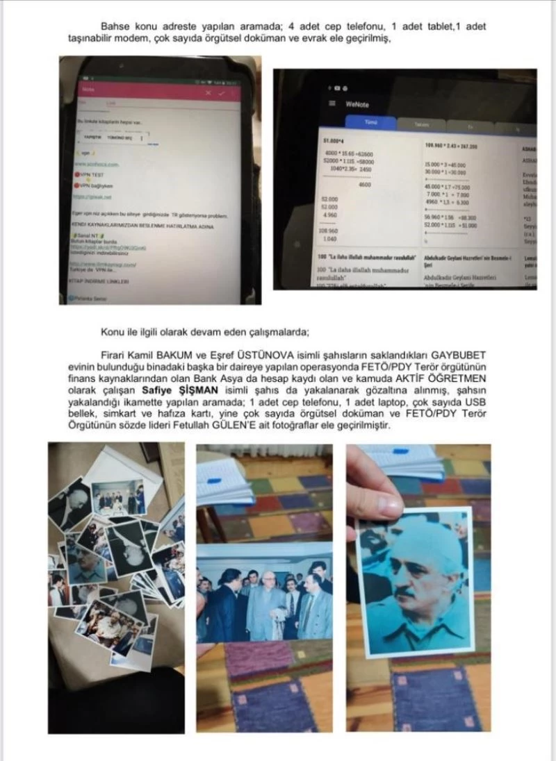 Gece FETÖ’ye ait hücre evine yapılan operasyonda, Eşref Üstünova ve Kamil Bakum yakalanarak gözaltına alınmış, baskında çok sayıda örgütsel dokümanlar ile örgüt lideri Gülen’in fotoğraflarının da aralarında olduğu çok sayıda fotoğraf ele geçirilmişti. Hücre evinde yakalanan zanlılardan örgüt imamı Kamil Bakum, 2009 yılında helikopter kazasında hayatını kaybeden BBP Lideri Muhsin Yazıcıoğlu’nun içindeki helikopterin enkazından cihazların sökülmesi olayında yargılanan 2 Astsubayın avukatlığını yürüten Mustafa Atalar’ı davayı üstlenmesi için yönlendiren kişi olarak biliniyor. Aynı soruşturma kapsamında yakalanan toplam 3 FETÖ üyesinin İstanbul Emniyet Müdürlüğü’ndeki sorgusu sürüyor.