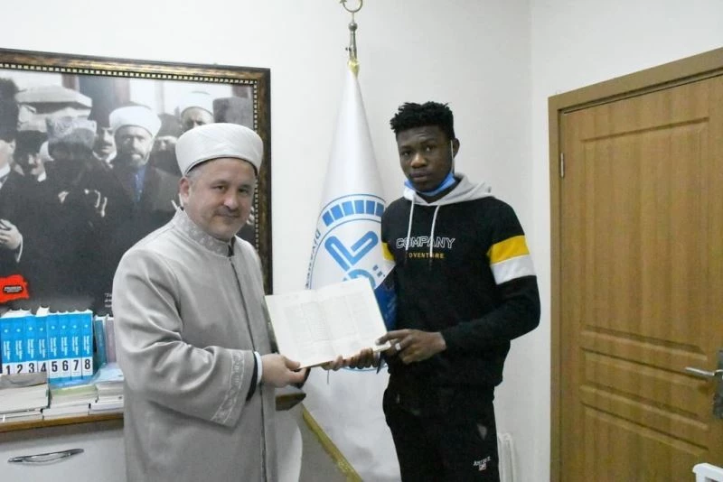 Müftü Demirtaş, ihtida töreni sonrasında üniversite öğrencisi İbrahim’e, Diyanet İşleri Başkanlığı tarafından basılan Fransızca anlatımlı dini eserler hediye etti.