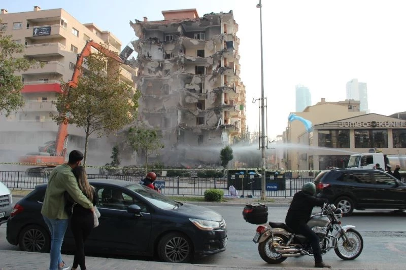 Özellikle Bayraklı ilçesinde kontrollü yıkım çalışmaları sürerken, Cumhuriyet Sitesi’nde bulunan bir binanın yıkım sırasında tamamen çökmesi de kameralara yansıdı.