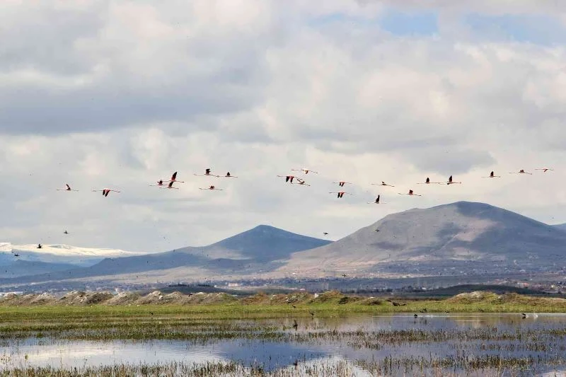 Bahar aylarının gelmesi ile birlikte göç etmeye başlayan Flamingolar, Kayseri’nin Melikgazi ilçesinde bulunan Hürmetçi Sazlığı’na geldi.
