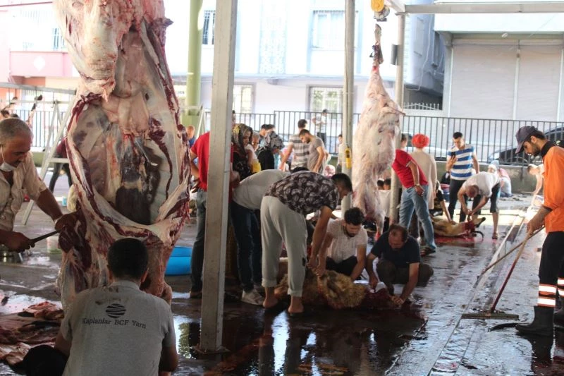 Büyükbaş kurbanları çok sayıda kişinin yardımıyla kesen kasapların kurbanları yere yatırmada zorluk yaşaması dikkat çekti. Kurbanları kesilen vatandaşlar etlerini parçalamak için uğraşırken kesilen kurbanların akan kanı kesim alanlarını kana buladı.