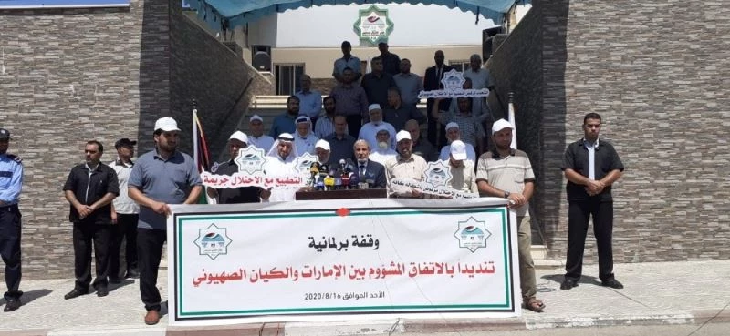 Filistin’de Birleşik Arap Emirlikleri (BAE) ile İsrail arasındaki ilişkilerin tamamen normalleştirilmesi kararına Filistinli siyasetçiler ve vatandaşlar tepki göstermeye devam ediyor. Gazze’de bir araya gelen Filistinli siyasetçiler BAE’yi protesto ederek "İsrail ile normalleşme bir suç", "Normalleştirmeye hayır" yazılı pankartlar açtı.