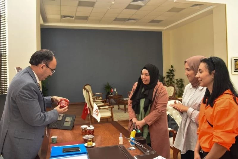 Bilecik Şeyh Edebali Üniversitesi Rektörü Prof. Dr. Şükrü Beydemir, Gıda Teknolojisi Bölümü Öğr. Gör. Mesut Kaplan ile öğrencilerini makamında ağırlayarak Bilecik’e özgü geleneksel ürünlerin etkin ve verimli şekilde kullanılması için fikir alışverişinde bulundu.