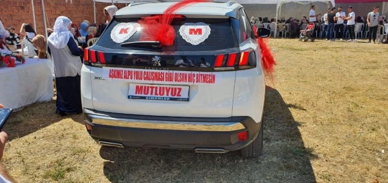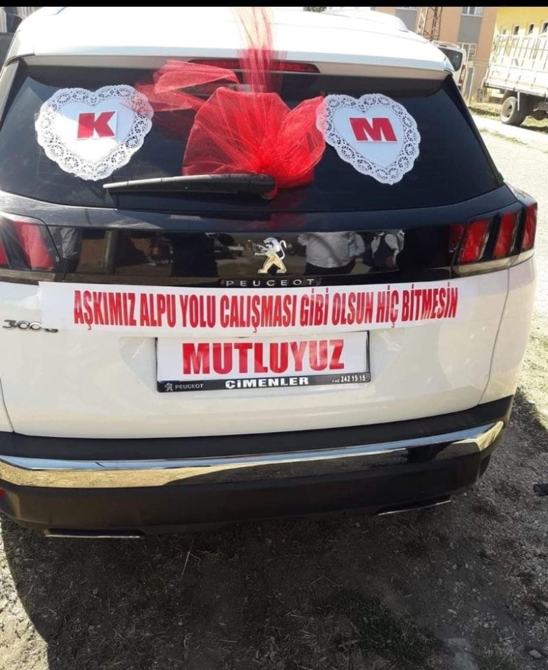 Eskişehir’de bir gelin ve damat, gelin arabalarının arkasına “Aşkımız Alpu yolu çalışması gibi olsun, hiç bitmesin” yazısı yazdırdı.