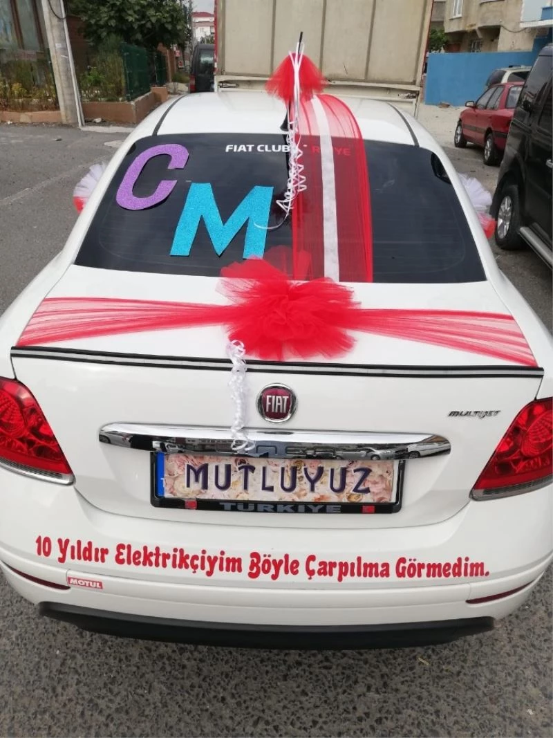 Cansu Kılınç ile dünya evine giren elektrik ustası Murat Güvenç, düğün arabasının arkasına ilginç ve bir o kadar da gülümseten bir yazı yazdırdı. Arabanın arkasına ‘’10 yıldır elektrikçiyim böyle çarpılma görmedim’’ yazdıran Güvenç, yazdığı bu yazı ile hem aşkını anlattı hem de yazıyı okuyanların yüzünü gülümsetti.