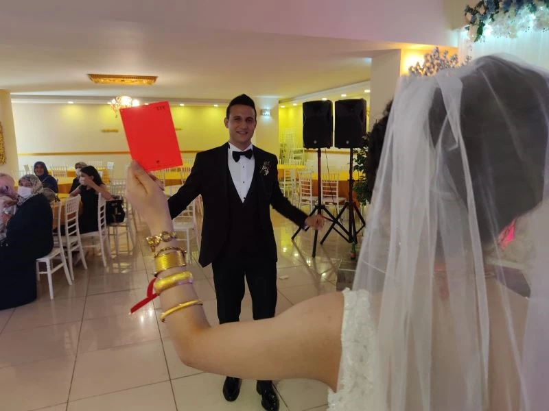 Özel bir düğün salonunda düzenlenen düğün törenine gelin ve damadın ailelerinin yanı sıra damadın hakem arkadaşları, spor camiası ve davetliler katıldı. Düğün töreninde gelin Tuğçe Kalender, futbol hakemi olan Muhammed Sevim’e kırmızı kart göstererek bekarlıktan ihraç etti. Mutlu günlerinde yanlarında sevenlerini görmekten dolayı çok memnun olduklarını dile getiren gelin Tuğçe Kalender, “Eşim, Ağrı bölgesinde Bölgesel Hakem olarak görev yapıyor. Kendisi sahalarda futbolculara kırmızı kart vererek oyundan ihraç ediyordu, bende düğünümüzde kendisine kırmızı kart vererek bekarlıktan ihraç ettim. Bu şekilde kendisine sürpriz yapmak istedim” dedi. Hakemliğin zor bir meslek olduğunu dile getiren Muhammed Sevim, düğün töreninde eşi tarafından yapılan sürpriz karşısında çok şaşırdığını ifade etti. Damat Sevim, “Eşim tarafından düğün törenimizde yapılan sürpriz beni çok şaşırttı. Futbol hakemliği gerçekten zor bir meslek. Herkese eşit mesafede durarak, adalet dağıtıyoruz. Eşimin bu mutlu günümüzde bana kırmızı kart göstererek bekarlıktan ihraç etmesi güzel bir olay oldu. Ömür boyu unutamayacağımız bir anı. Ayrıca bu mutlu günümüzde bizleri yalnız bırakmayan tüm herkese teşekkür ederim” dedi.