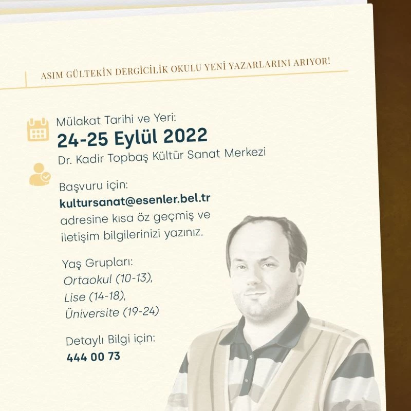Esenler Belediyesi, merhum eğitimci-yazar Asım Gültekin’in adını taşıyan “Dergicilik Okulu”nun üçüncüsüne ev sahipliği yapmaya hazırlanıyor. Ortaokul, lise ve üniversite öğrencilerinin dergicilik hayalini gerçeğe dönüştürecek programda mülakatlar 24-25 Eylül 2022 tarihlerinde yapılacak.
