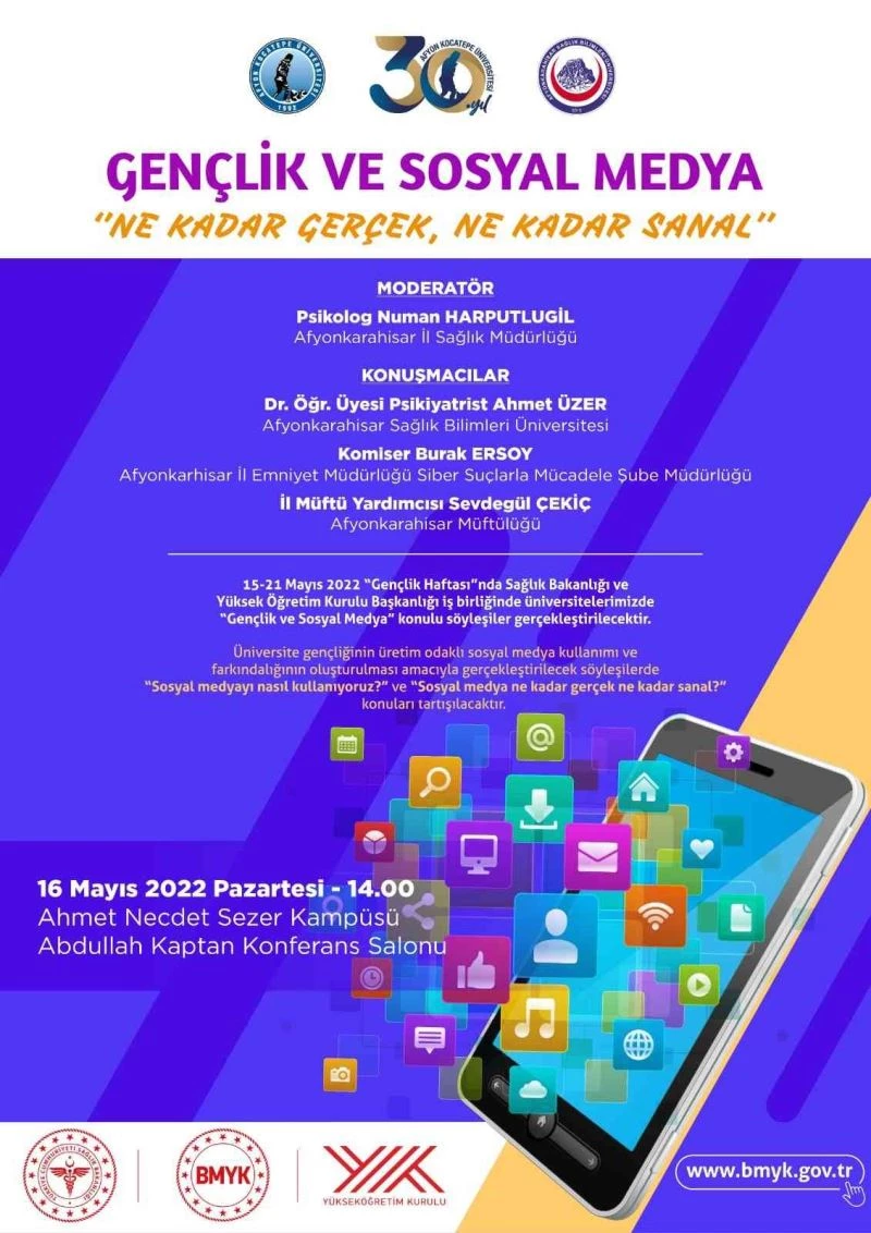 Afyonkarahisar İl Sağlık Müdürlüğü tarafından 15-21 Mayıs Gençlik Haftası etkinlikleri çerçevesinde ‘Gençlik ve Sosyal Medya’ konulu söyleşiler yapılacağı kaydedildi.