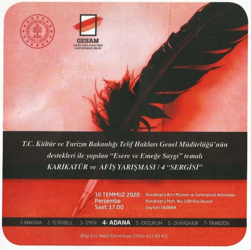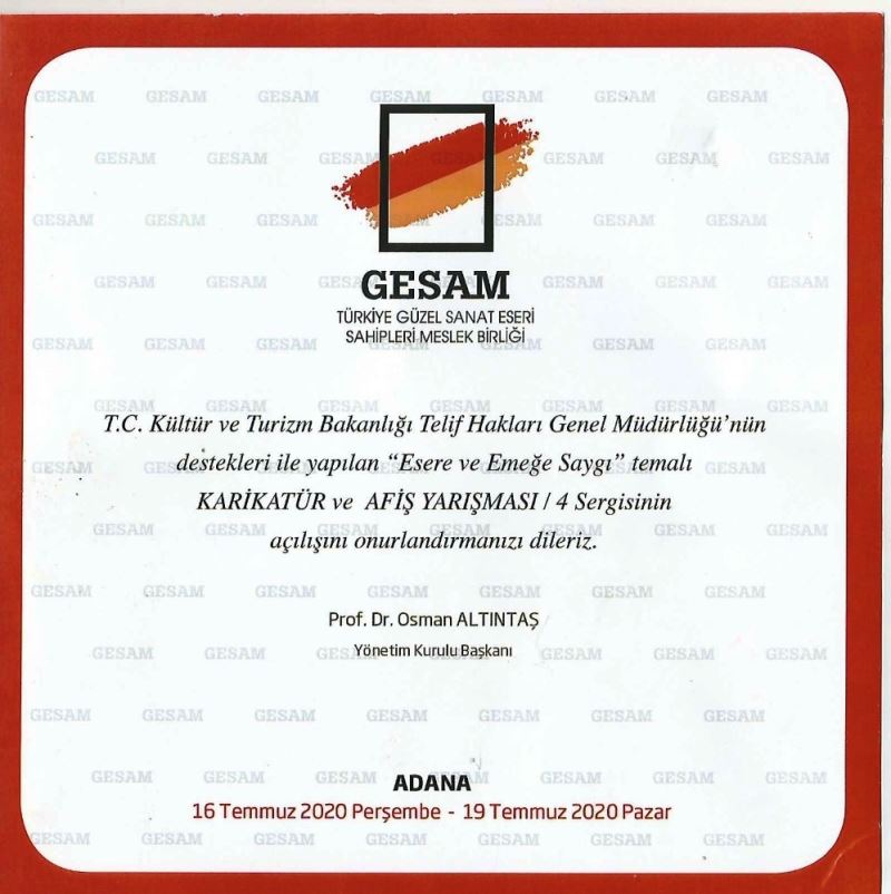 Türkiye Güzel Sanat Eseri Sahipleri Meslek Birliği (GESAM) Yönetim Kurulu Başkanı Prof. Dr. Osman Altıntaş’ın verdiği bilgiye göre, Kültür ve Turizm Bakanlığı Telif Hakları Genel Müdürlüğü’nün desteğiyle yapılan “Esere ve Emeğe Saygı” temalı karikatür ve Afiş Yarışması sergileri daha önce Ankara, İstanbul ve İzmir’de açıldı. Adana’dan sonra Erzurum, Diyarbakır ve Trabzon’da da açılacak.
