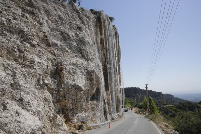 Antalya Büyükşehir Belediyesi, Konyaaltı ilçesine bağlı Geyik Bayırı Mahallesi grup yolunda tehlike arz eden kayalık alana, taş ve toprak düşmelerine karşı çelik ağ çekerek önlem alıyor.